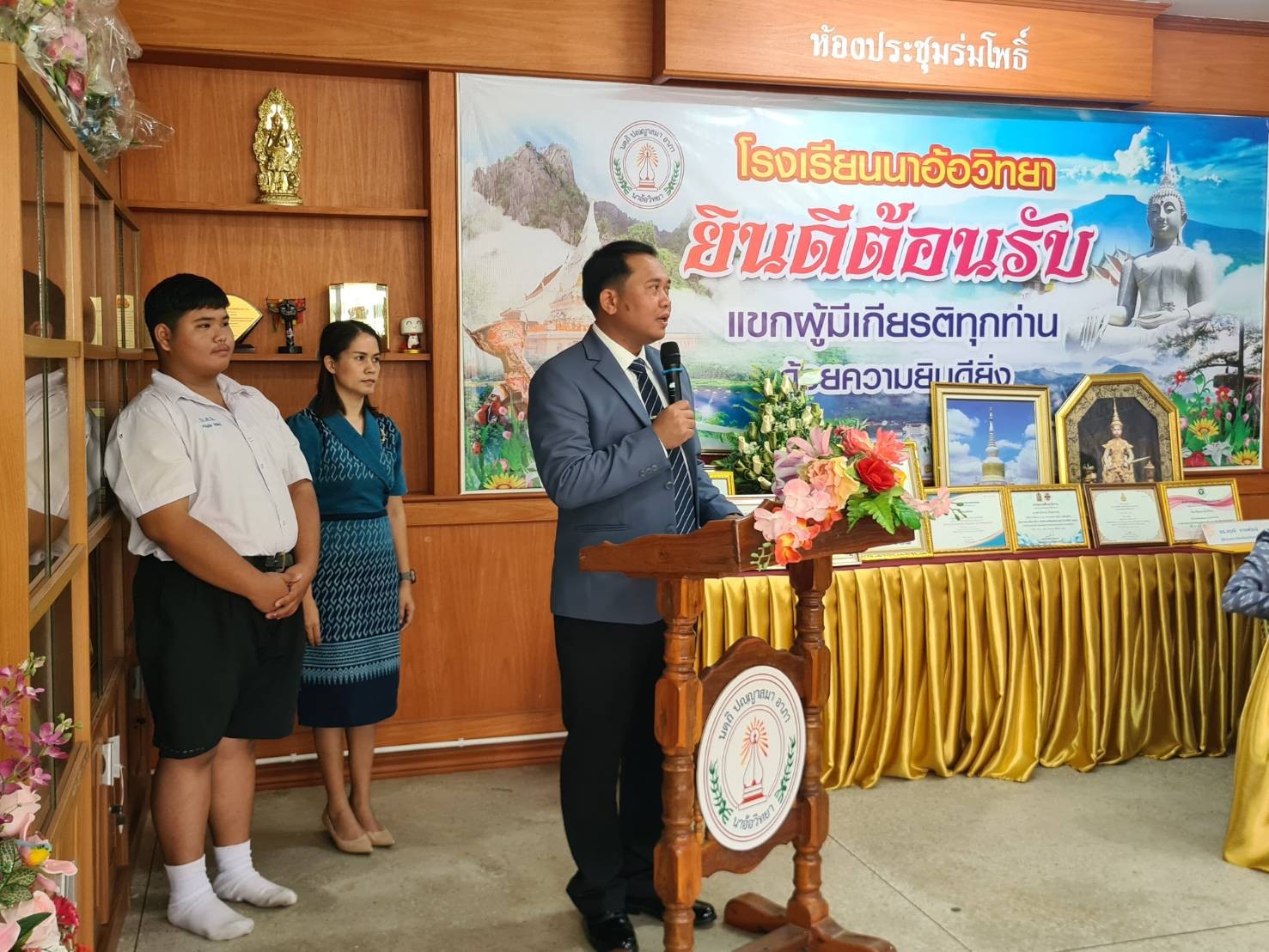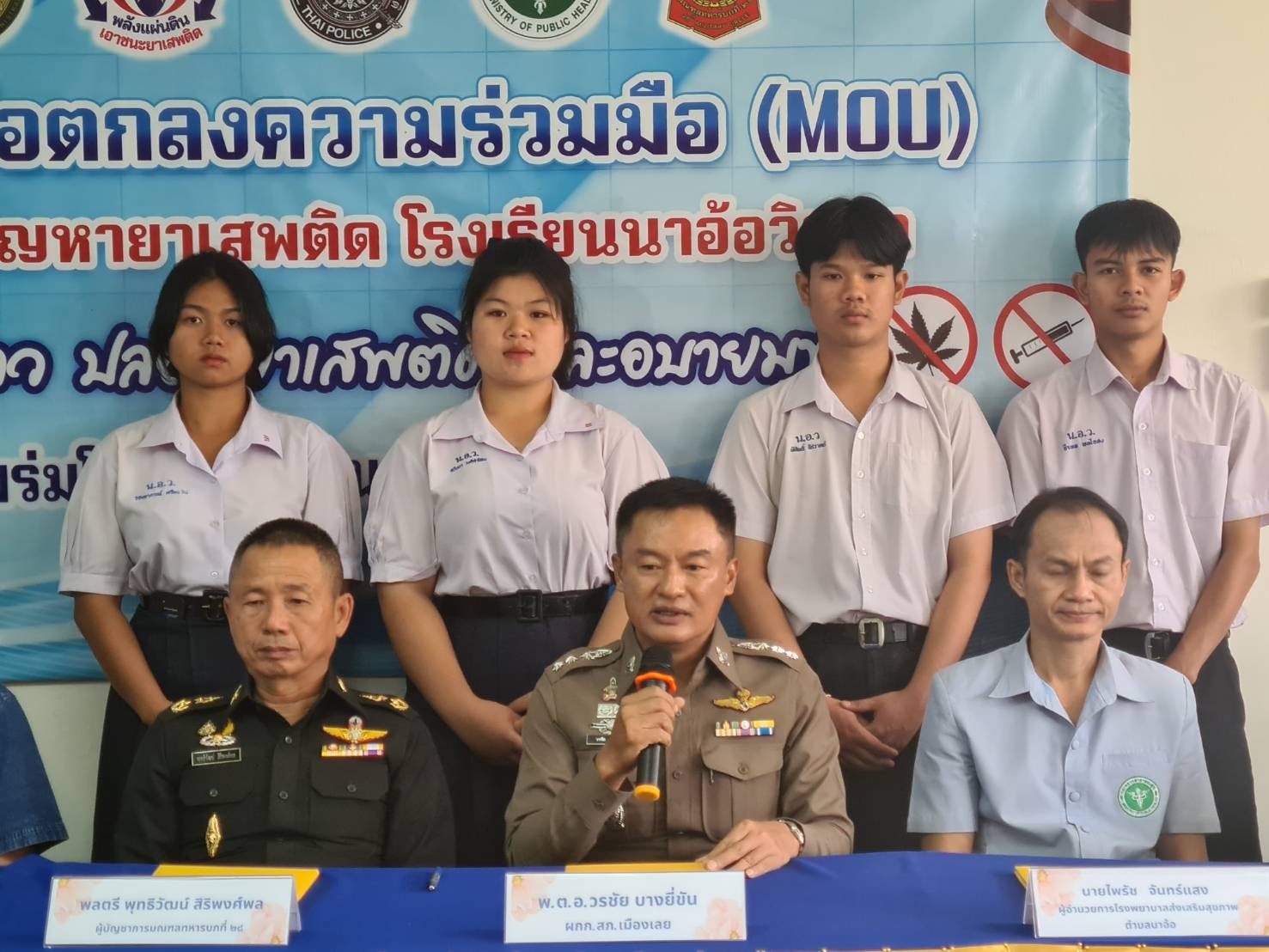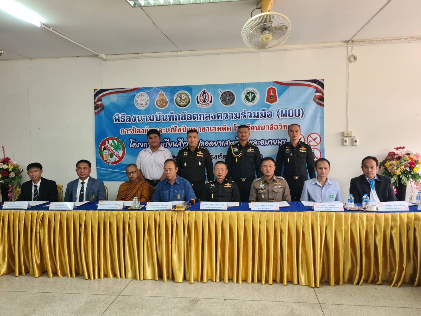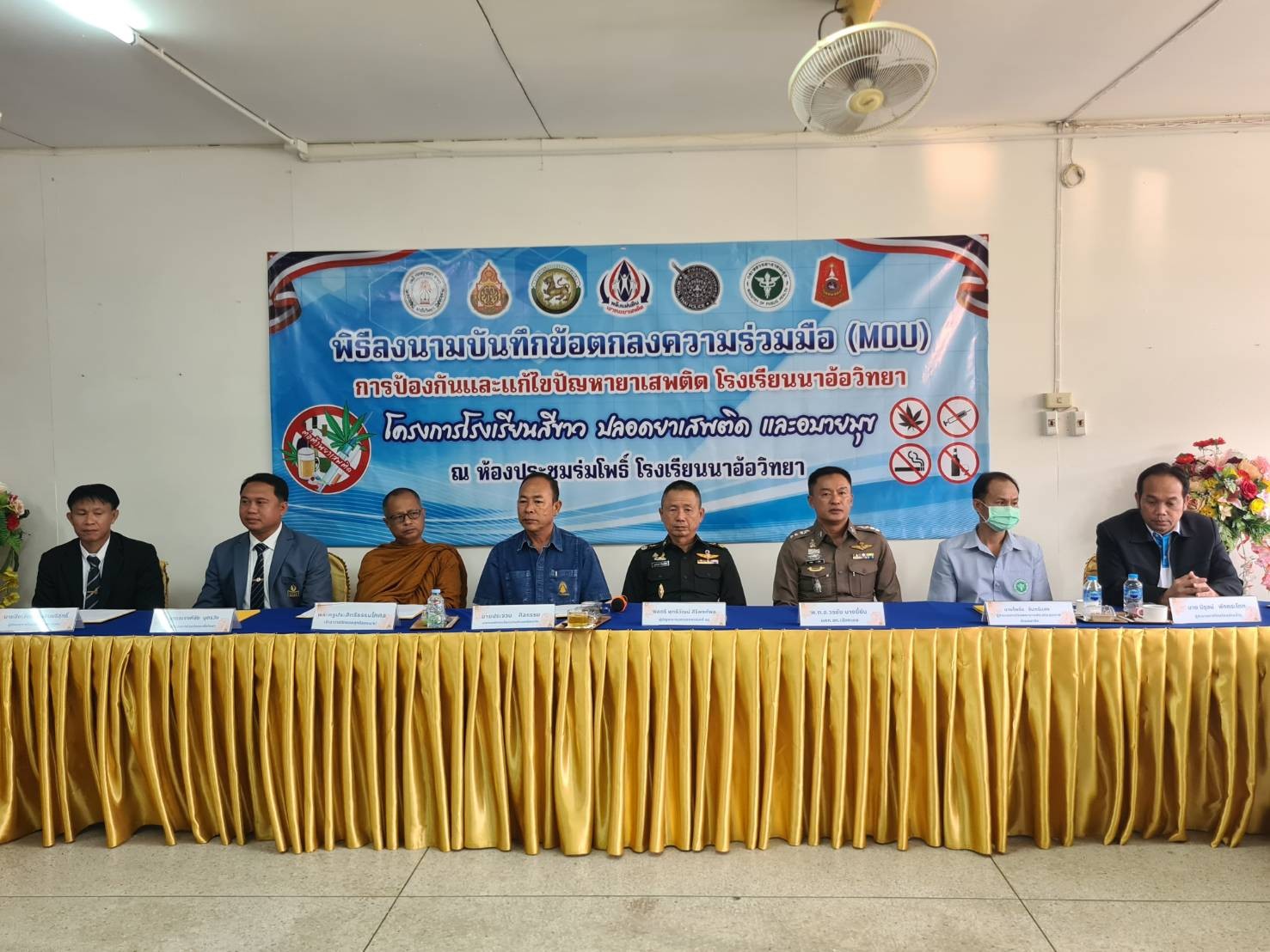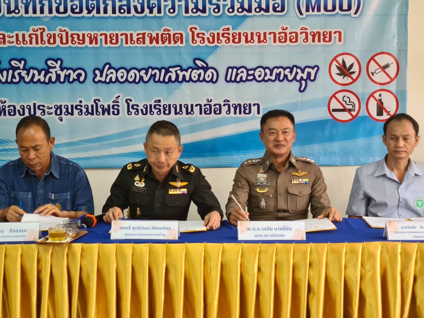 สุทธิธรรม(ธ) นายณรงค์ชัย บุตรวัง ผอ.รร.นาอ้อวิทยา ดร.เอมจิตร สมสืบ ผอ.รร.น้ำสวยพิทยาสรรค์นายสหรัฐ เต็มวงษ์ ผอ.รร.เขาแก้ววิทยาสรรค์ นายปิยะวัฒน์ แสนบริสุทธิ์ ผอ.รร.ธาตุพิทยาคม นายนิรุจน์ พักกระโทก ผอ.รร.บ้านน้ำภู นายไพรัช จันทร์แสง ผอ.รพ.สต.นาอ้อนายสุรศักดิ์ อินทรศักดิ์ ผญบ.ม.2 ต.นาอ้อ ร่วมพิธีลงนามบันทึกข้อตกลงความร่วมมือ(MOU)การป้องกันและแก้ไขปัญหายาเสพติด โครงการ โรงเรียนสีขาว ปลอดยาเสพติดและอบายมุข ณ ห้องประชุมร่มโพธิ์ รร.นาอ้อวิทยา